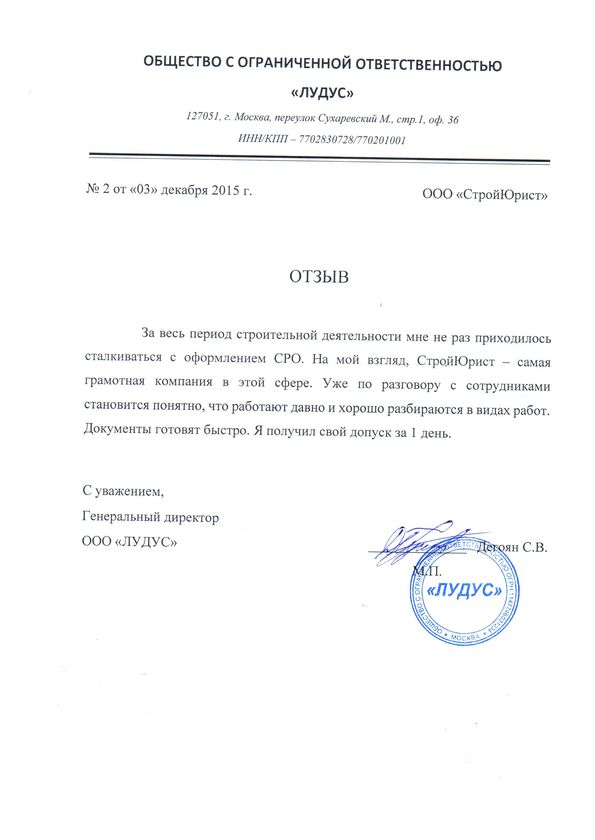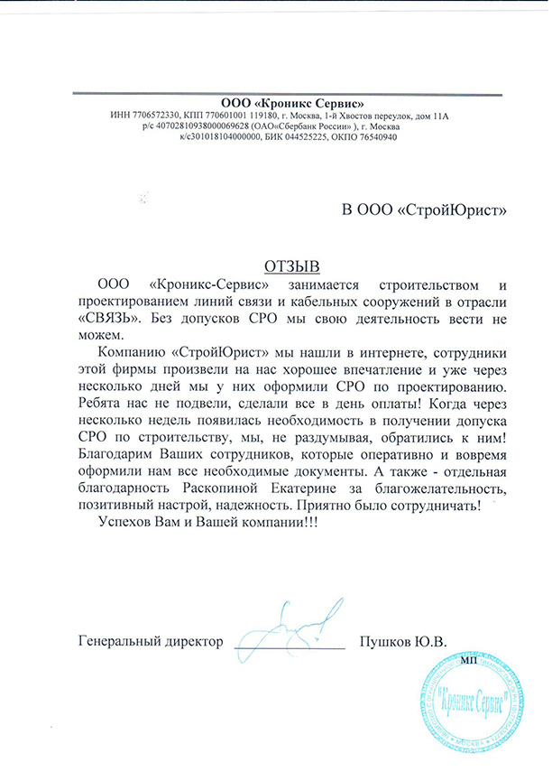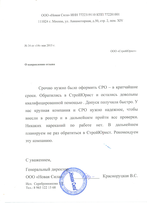 Отзывы клиентов "СтройЮрист" по вступлению в СРО в Березниках