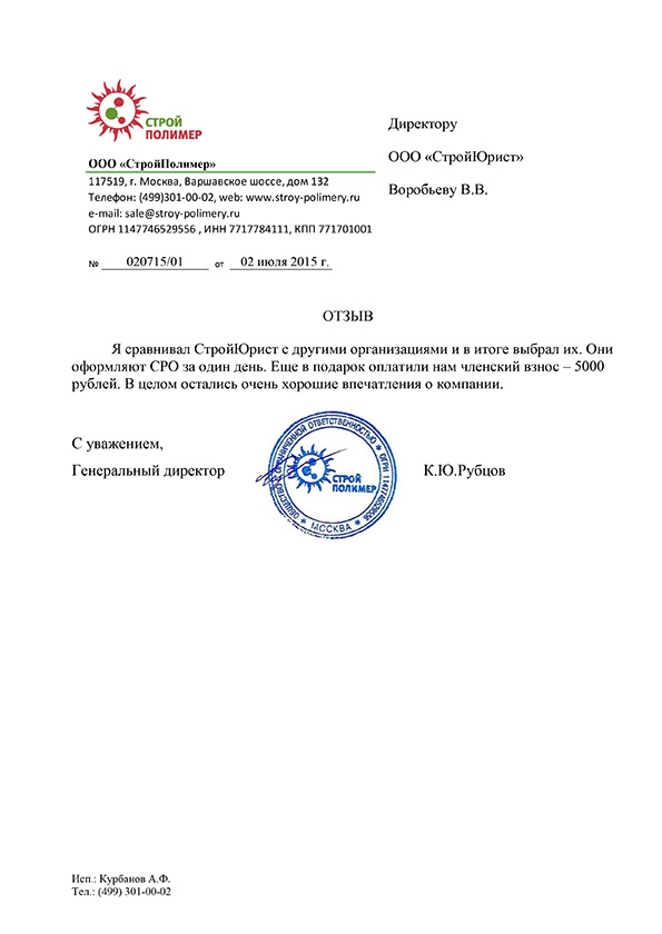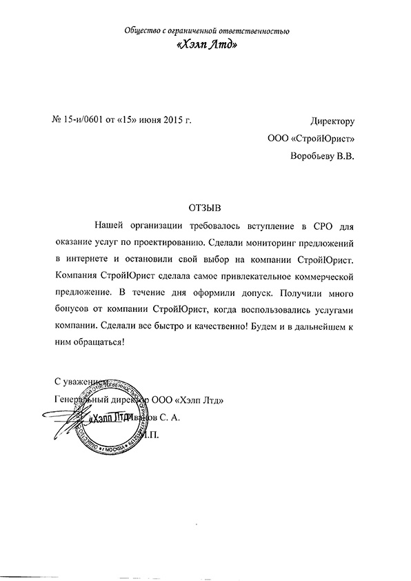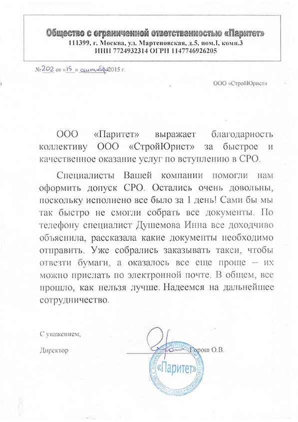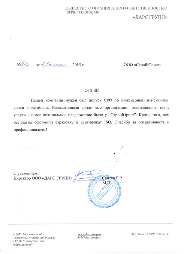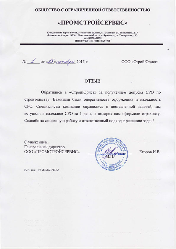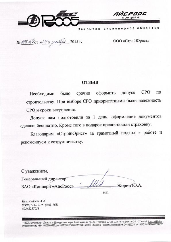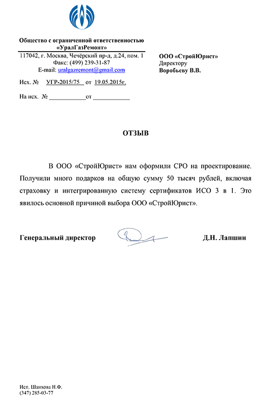 Отзывы клиентов "СтройЮрист" по вступлению в СРО в Березниках
