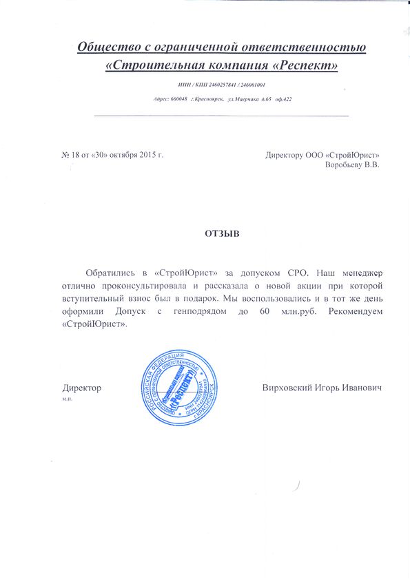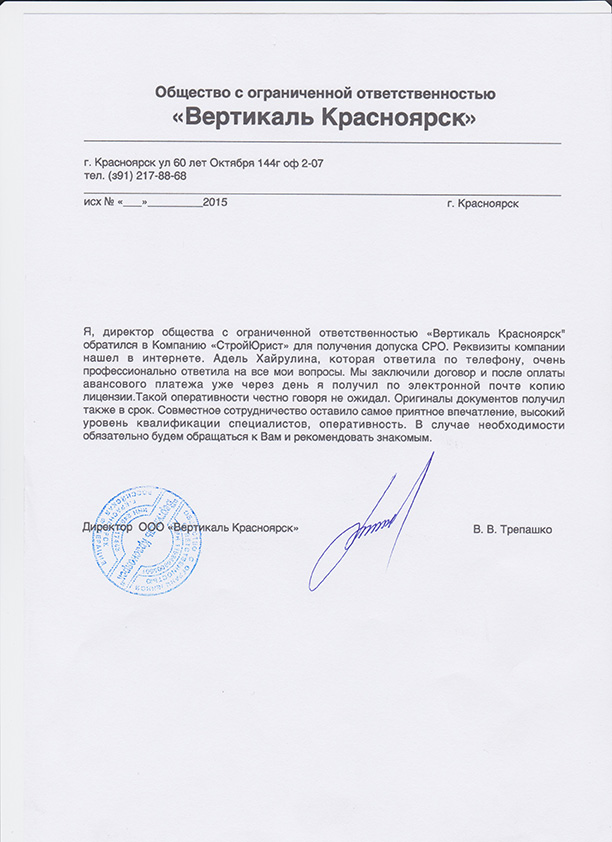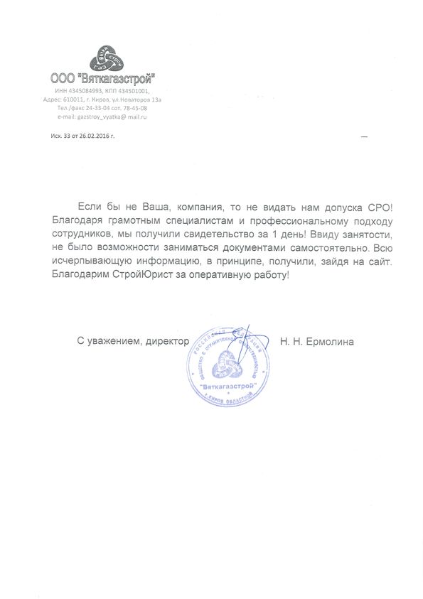 Отзывы клиентов "СтройЮрист" по вступлению в СРО в Березниках
