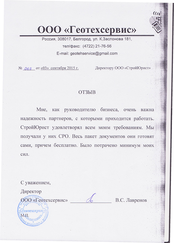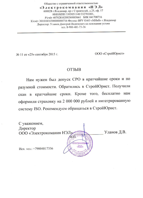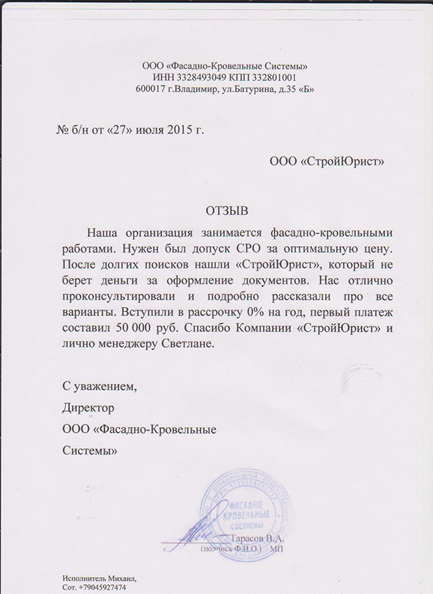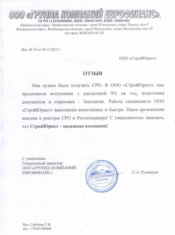 Отзывы клиентов "СтройЮрист" по вступлению в СРО в Березниках