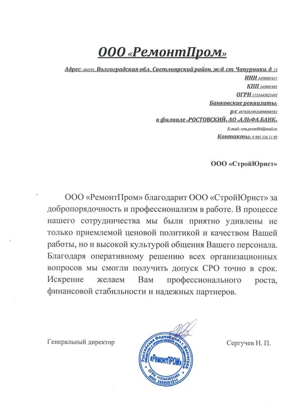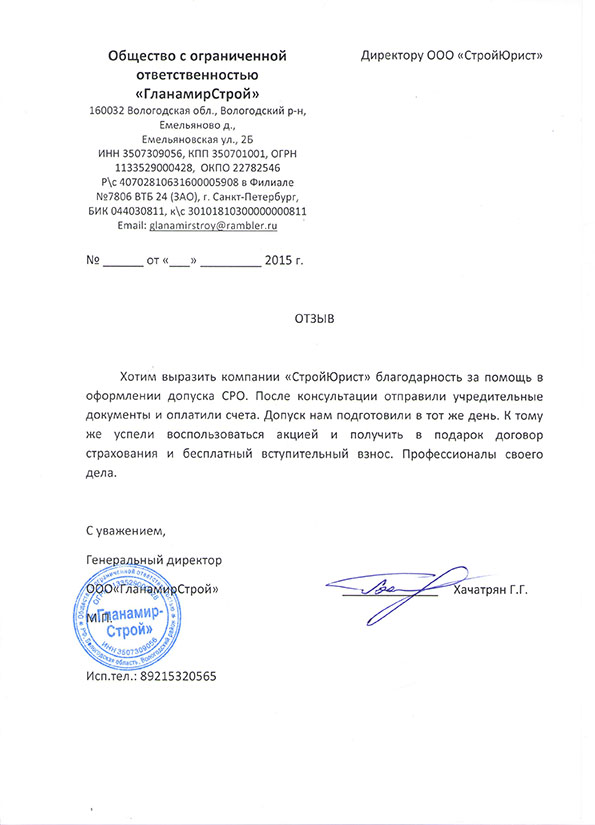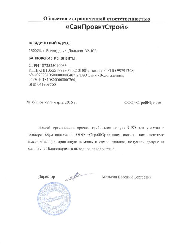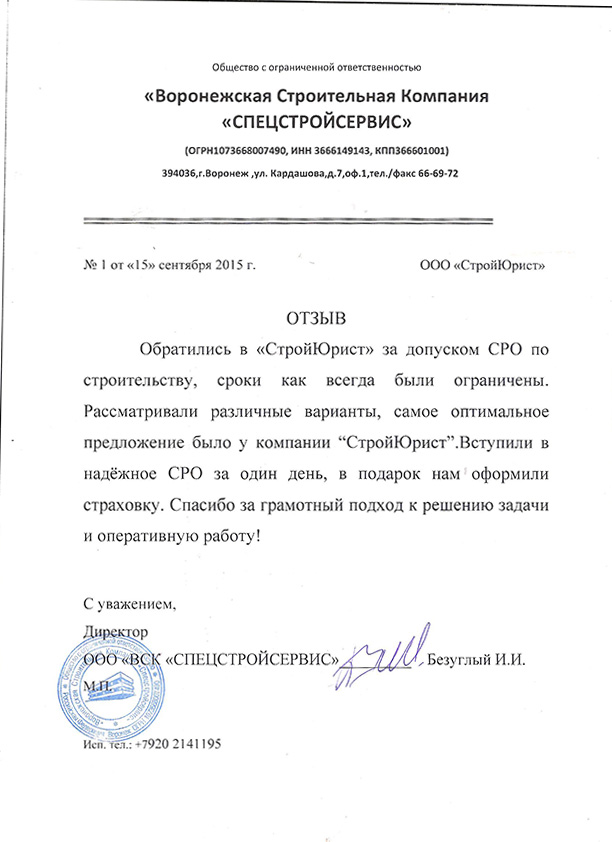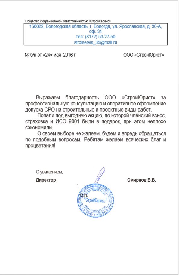 Отзывы клиентов "СтройЮрист" по вступлению в СРО в Березниках